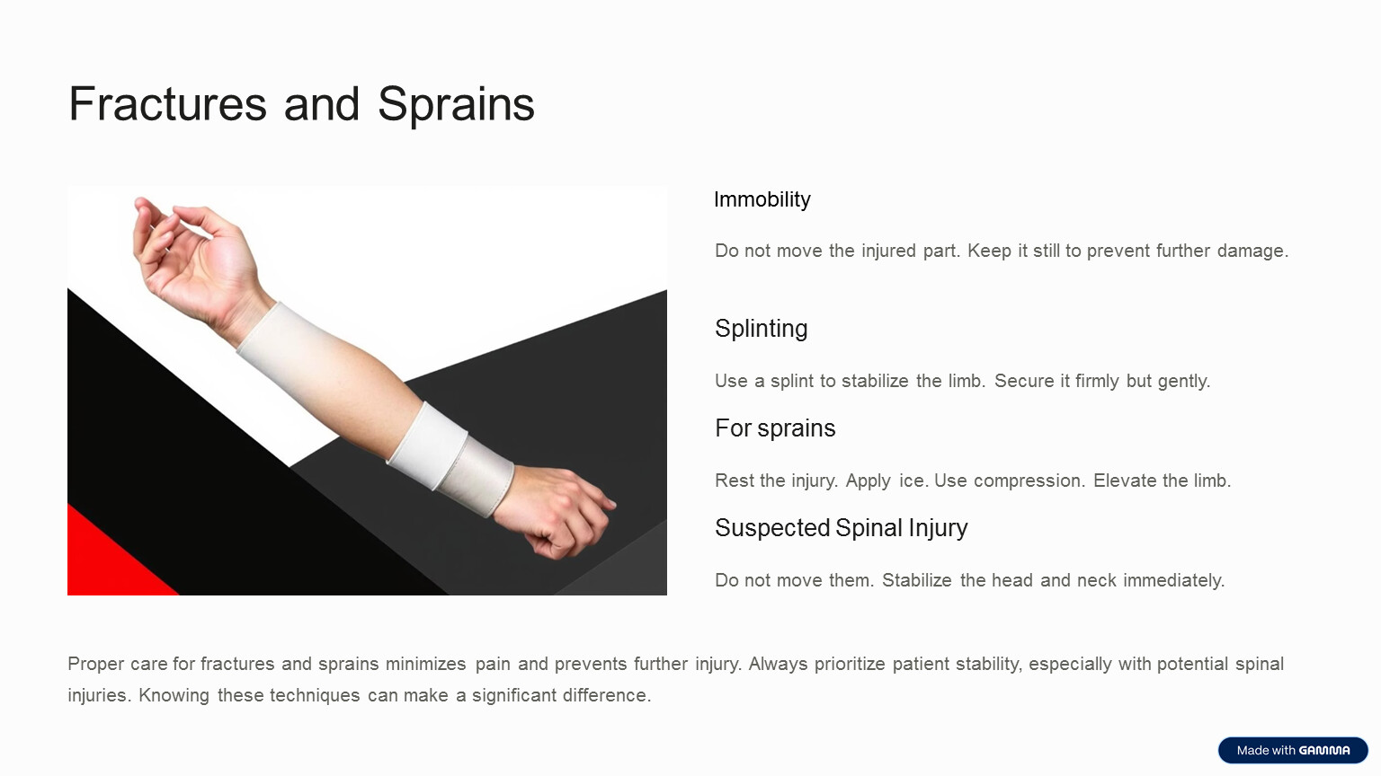 Proper care for fractures and sprains minimizes pain and prevents further injury. Always prioritize patient stability, especially with potential spinal injuries. Knowing these techniques can make a significant difference.