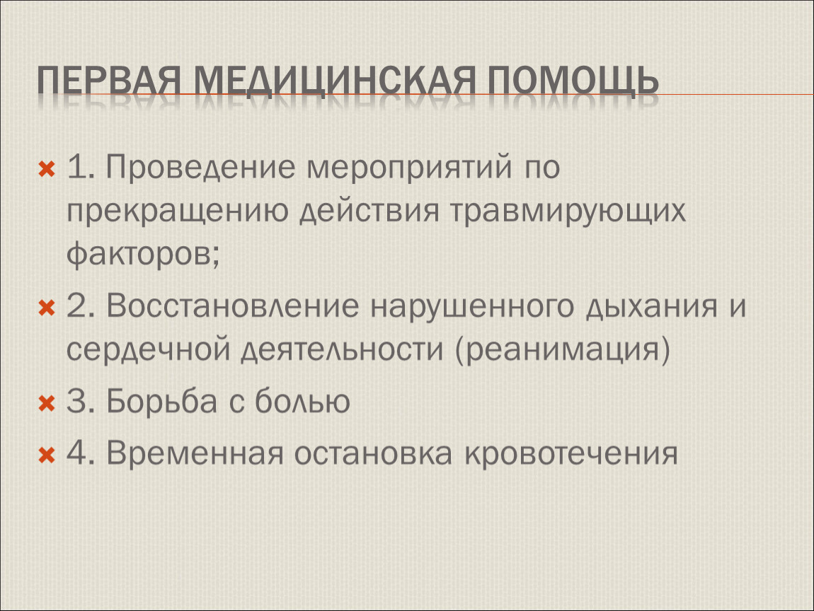 1. Проведение мероприятий по прекращению действия травмирующих факторов;