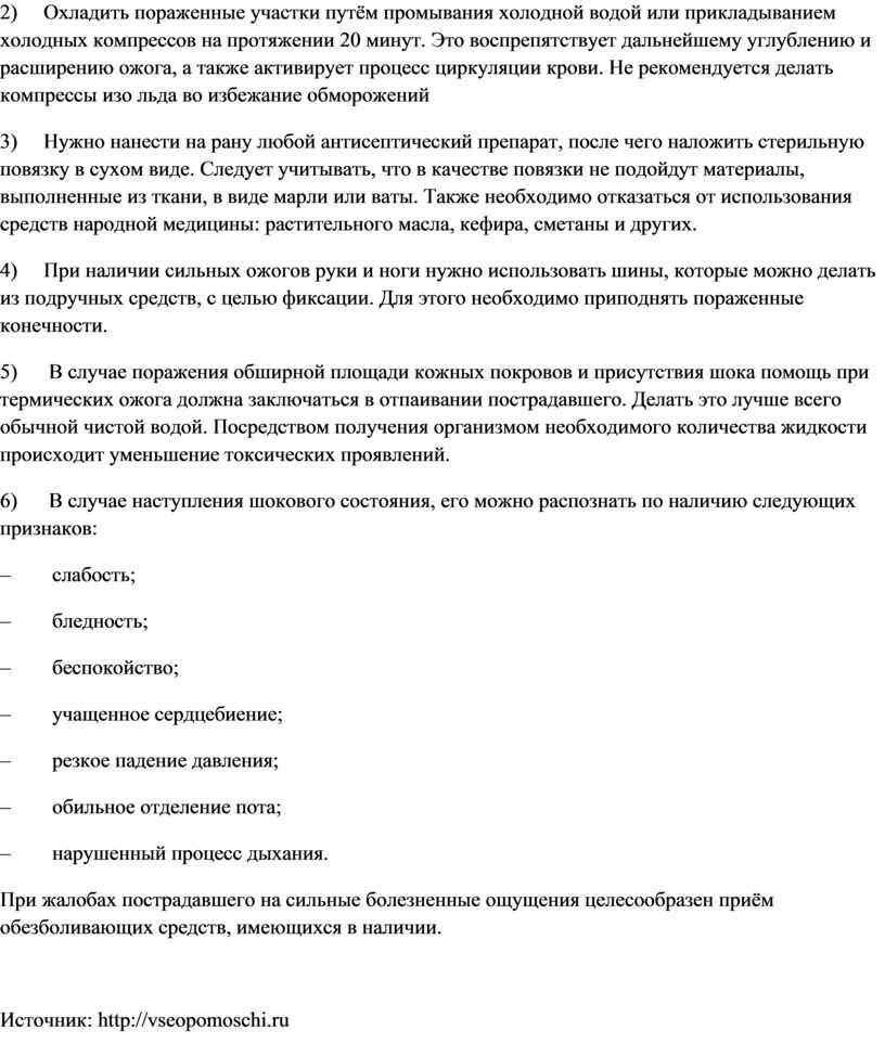 5) В случае поражения обширной площади кожных покровов и присутствия шока помощь при термических ожога должна заключаться в отпаивании пострадавшего. Делать это лучше всего обычной чистой водой. Посредством получения организмом необходимого количества жидкости происходит уменьшение токсических проявлений.