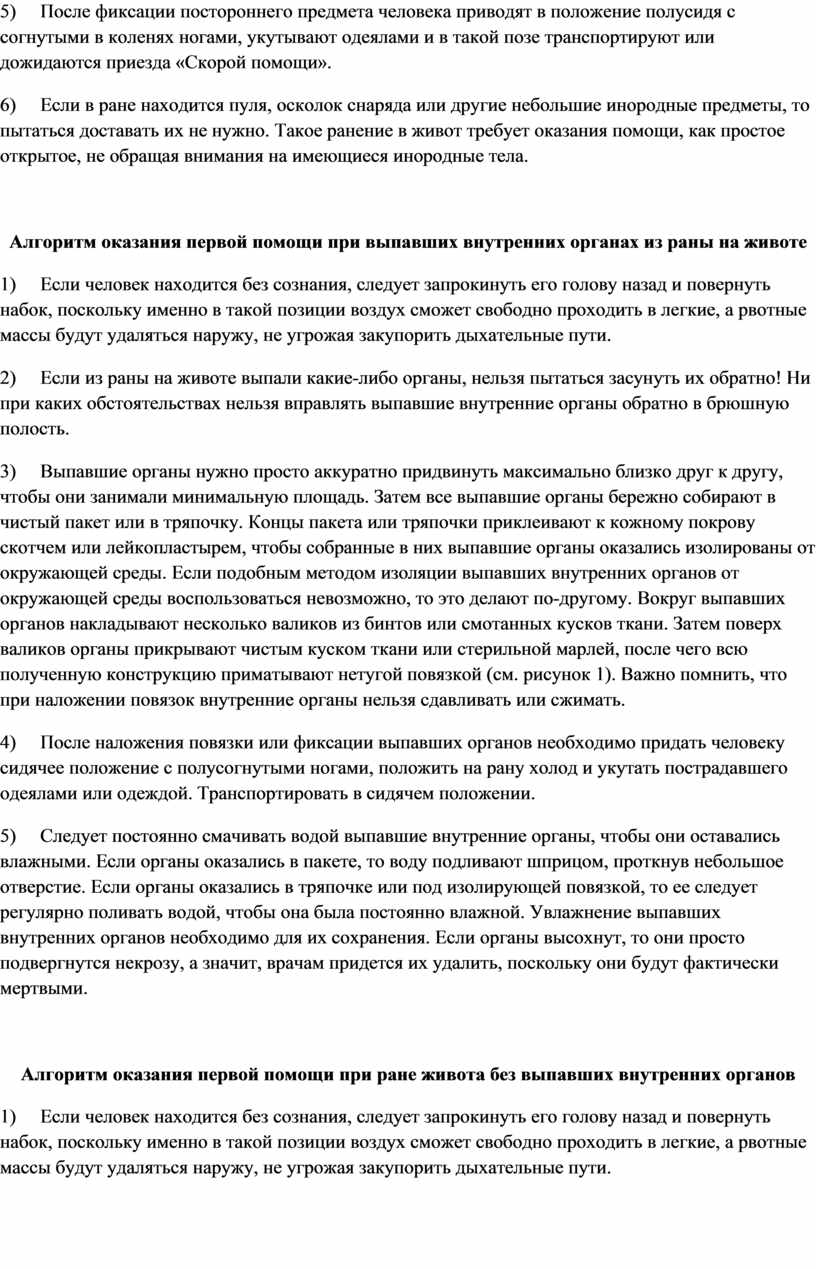 Алгоритм оказания первой помощи при выпавших внутренних органах из раны на животе