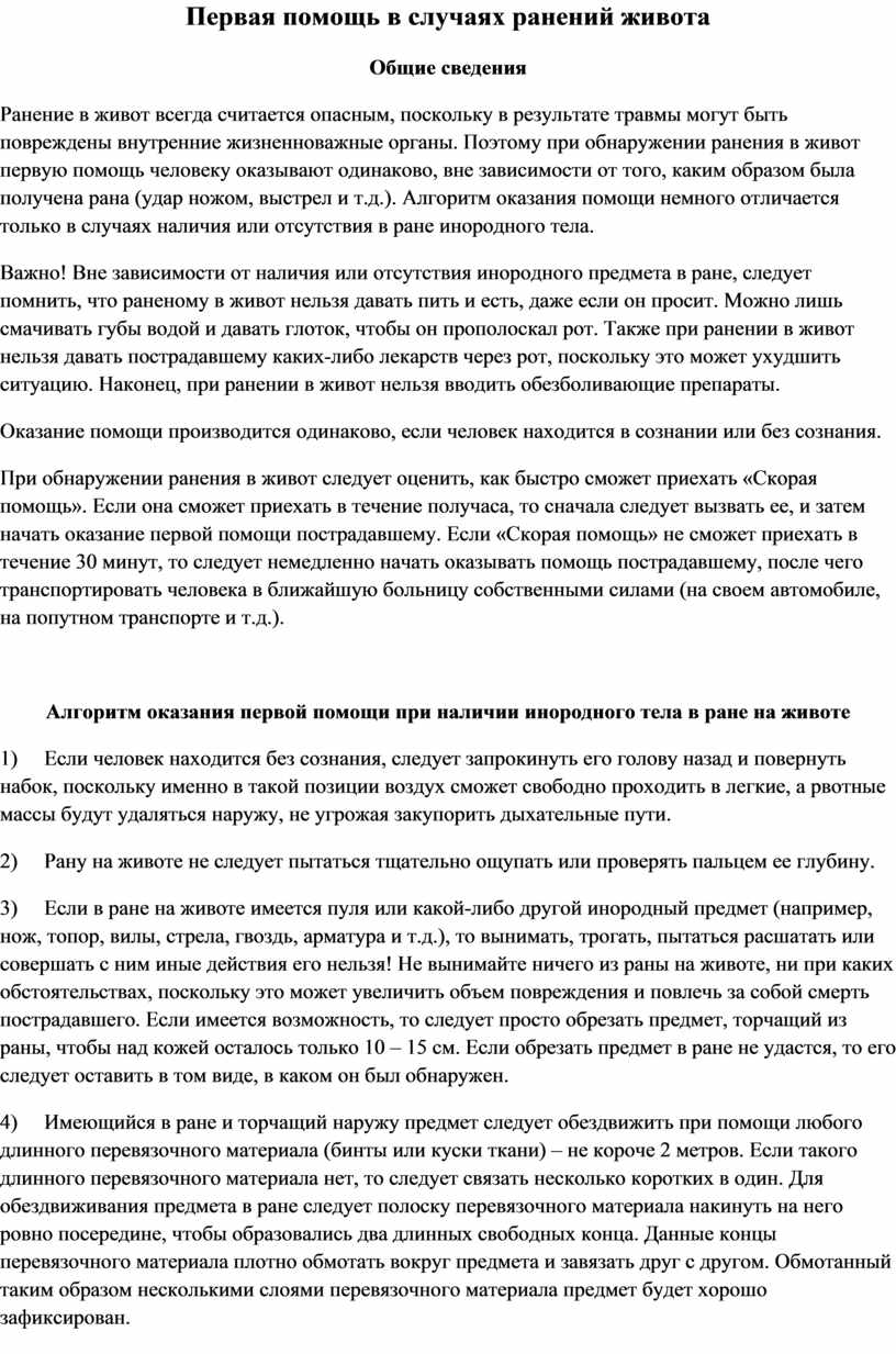 Алгоритм оказания первой помощи при наличии инородного тела в ране на животе