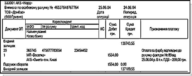 В банківській виписці за дебетом відображено списання грошових коштів з поточного рахунку, а за кредитом – надходження грошових коштів на поточний рахунок.