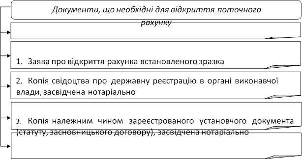 Для відкриття поточного рахунку підприємства подають установам банків наступні документи (рис. 10.7):