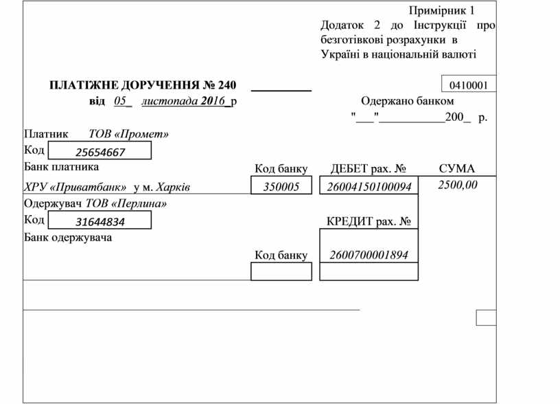 ПЛАТІЖНЕ ДОРУЧЕННЯ № 240 0410001