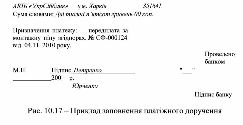Рис. 10.17 – Приклад заповнення платіжного доручення