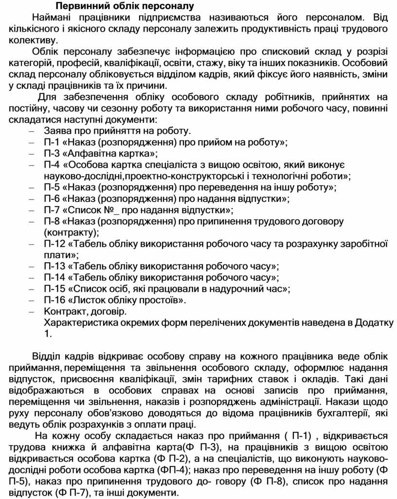 На кожну особу складається наказ про приймання ( П-1) , відкривається трудова книжка й алфавітна карта(Ф П-3), на працівників з вищою освітою відкривається особова картка (Ф П-2), а на спеціалістів, що виконують науково-дослідні роботи особова картка (Ф П-4); наказ про переведення на іншу роботу (Ф П-5), наказ про припинення трудового до- говору (Ф П-8), список про надання відпусток (Ф П-7), та інші документи.