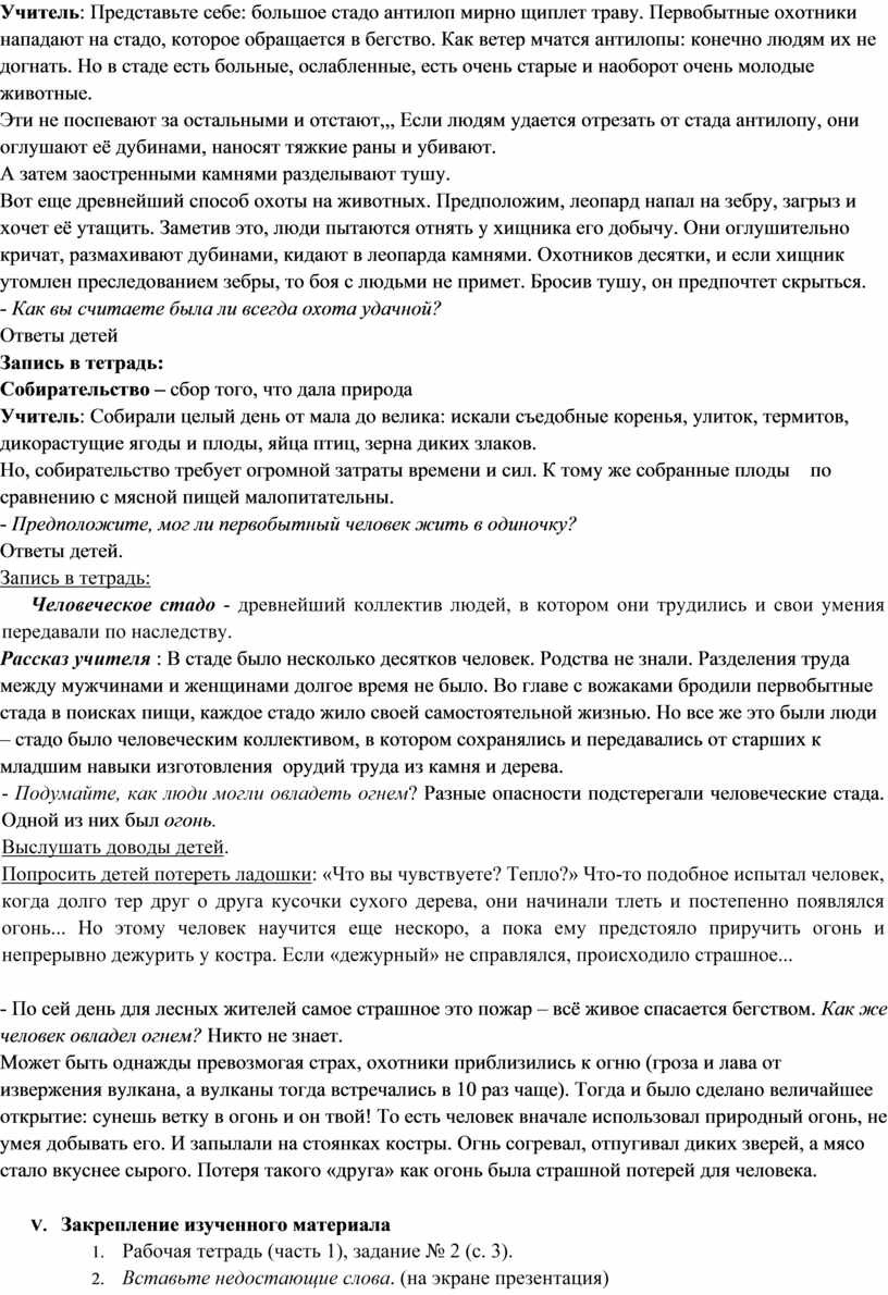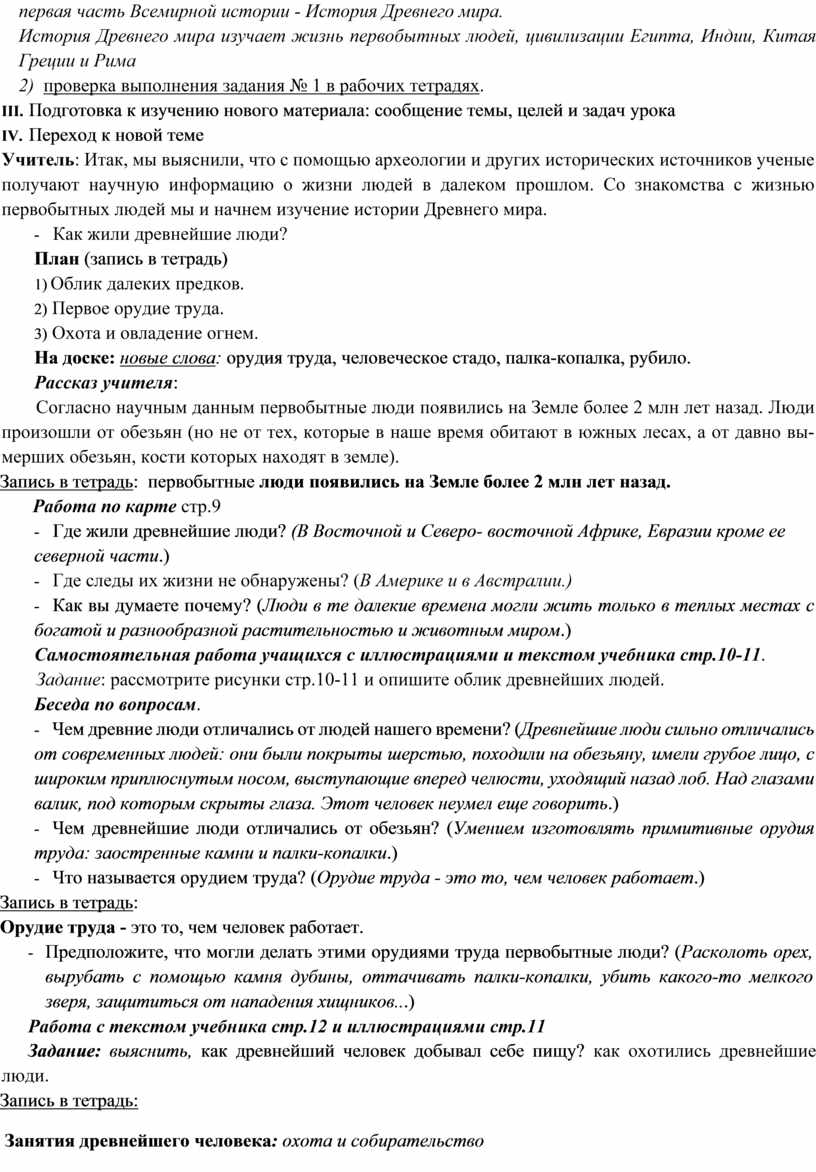Учитель: Итак, мы выяснили, что с помощью археологии и других исторических источников ученые получают научную информацию о жизни людей в далеком прошлом. Со знакомства с жизнью первобытных людей мы и начнем изучение истории Древнего мира.