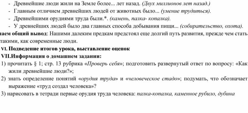 1) прочитать § 1; стр. 13 рубрика «Проверь себя»; подготовить развернутый ответ по вопросу: «Как жили древнейшие люди?»;