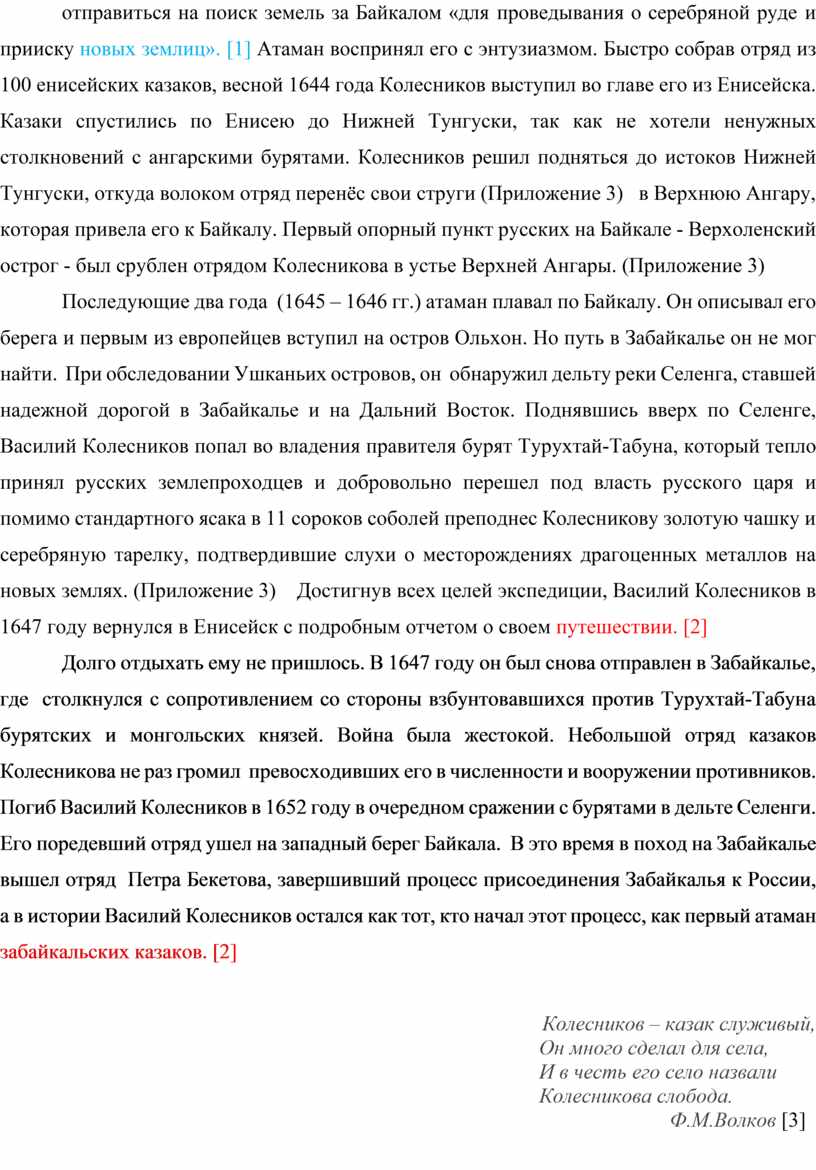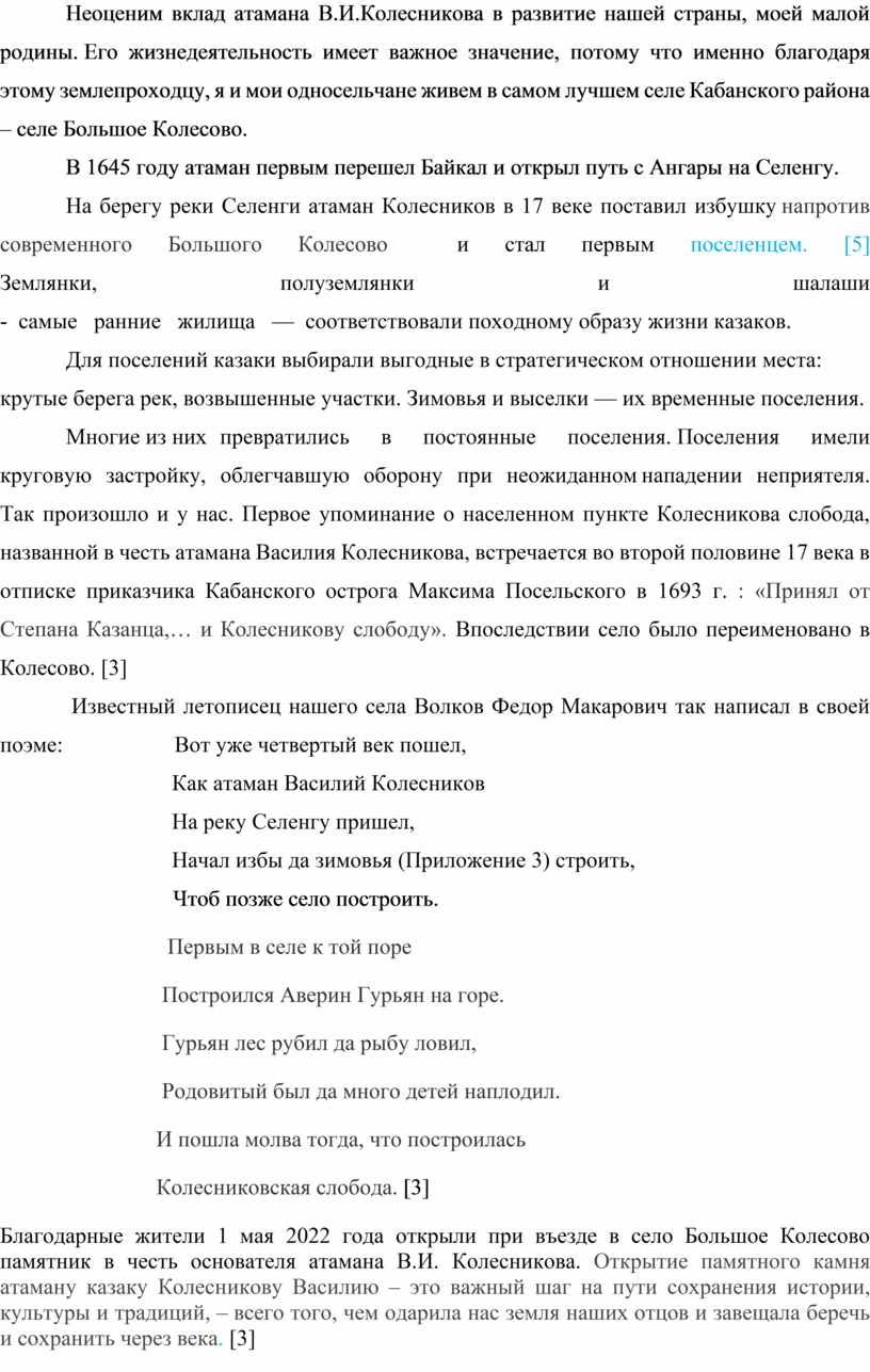 Неоценим вклад атамана В.И.Колесникова в развитие нашей страны, моей малой родины. Его жизнедеятельность имеет важное значение, потому что именно благодаря этому землепроходцу, я и мои односельчане живем в самом лучшем селе Кабанского района – селе Большое Колесово.
