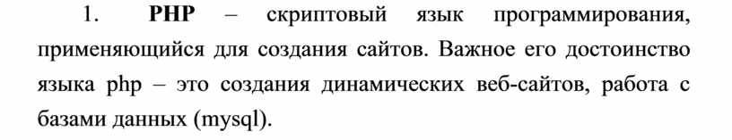 1. PHP – скриптовый язык программирования, применяющийся для создания сайтов. Важное его достоинство языка php – это создания динамических веб-сайтов, работа с базами данных (mysql).