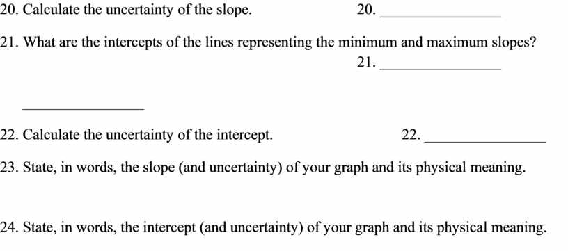24. State, in words, the intercept (and uncertainty) of your graph and its physical meaning.