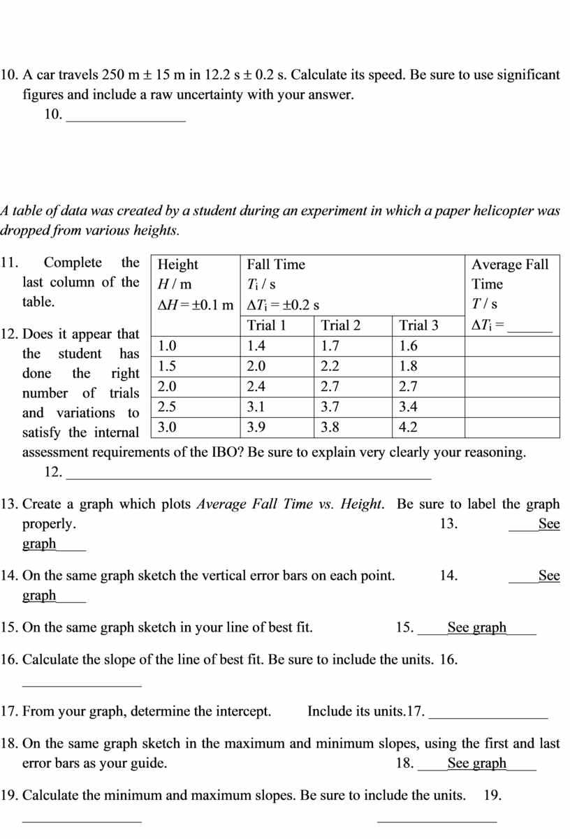 10. A car travels 250 m ± 15 m in 12.2 s ± 0.2 s. Calculate its speed. Be sure to use significant figures and include a raw uncertainty with your answer. 10. ________________