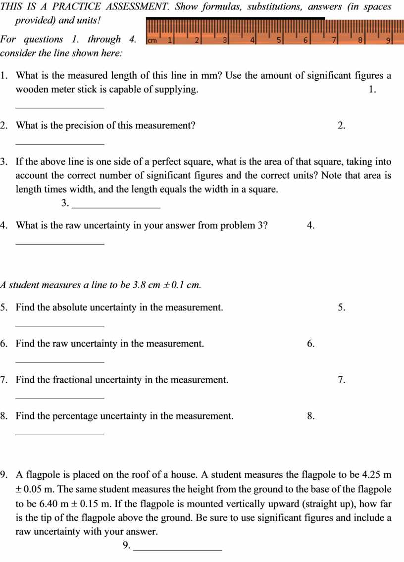 9. A flagpole is placed on the roof of a house. A student measures the flagpole to be 4.25 m ± 0.05 m. The same student measures the height from the ground to the base of the flagpole to be 6.40 m ± 0.15 m. If the flagpole is mounted vertically upward (straight up), how far is the tip of the flagpole above the ground. Be sure to use significant figures and include a raw uncertainty with your answer. 9. _________________