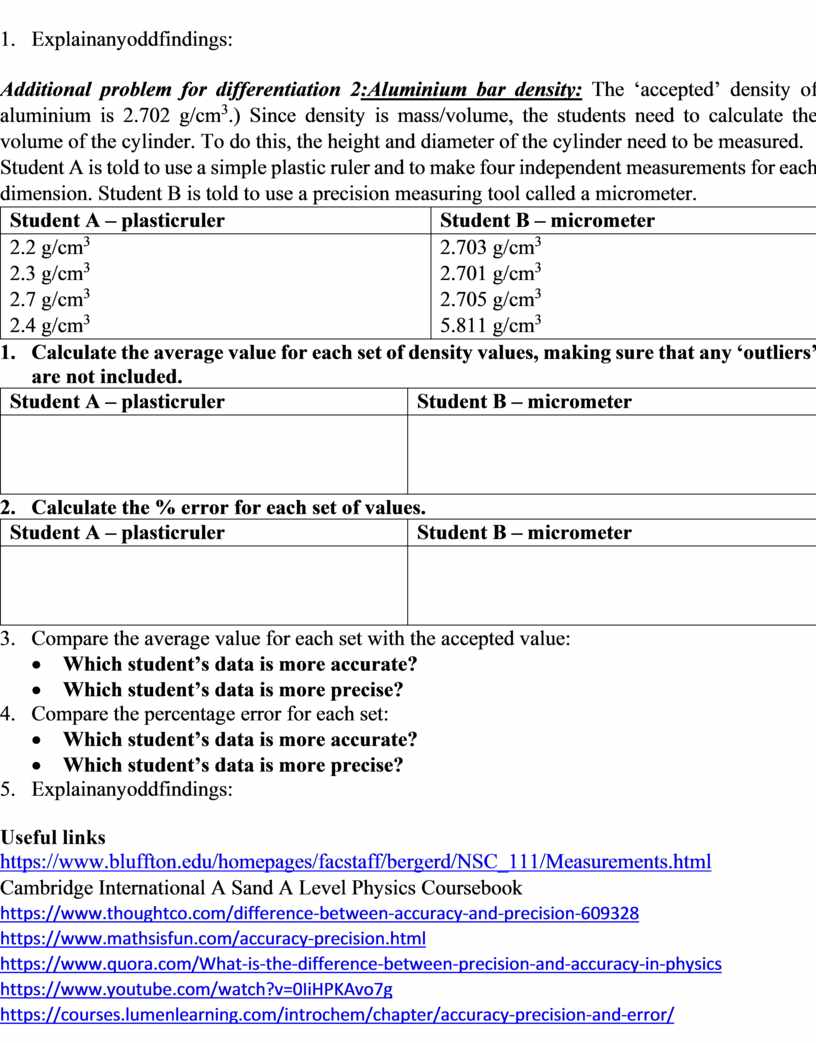 Additional problem for differentiation 2:Aluminium bar density: The ‘accepted’ density of aluminium is 2.702 g/cm3.) Since density is mass/volume, the students need to calculate the volume of the cylinder. To do this, the height and diameter of the cylinder need to be measured.