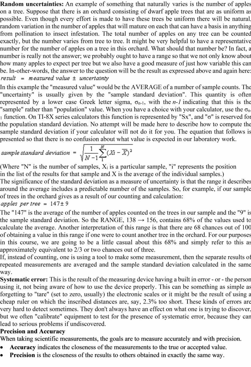 Random uncertainties: An example of something that naturally varies is the number of apples on a tree. Suppose that there is an orchard consisting of dwarf apple trees that are as uniform as possible. Even though every effort is made to have these trees be uniform there will be natural, random variation in the number of apples that will mature on each that can have a basis in anything from pollination to insect infestation. The total number of apples on any tree can be counted exactly, but the number varies from tree to tree. It might be very helpful to have a representative number for the number of apples on a tree in this orchard. What should that number be? In fact, a number is really not the answer; we probably ought to have a range so that we not only know about how many apples to expect per tree but we also have a good measure of just how variable this can be. In-other-words, the answer to the question will be the result as expressed above and again here: