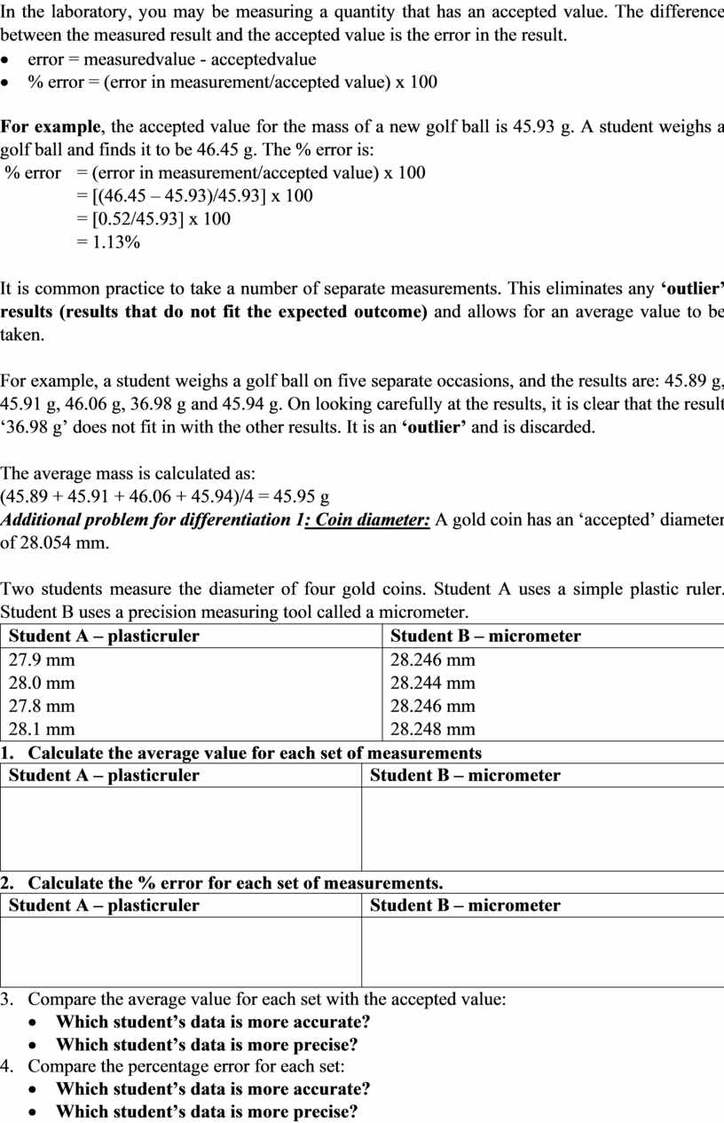 For example, the accepted value for the mass of a new golf ball is 45.93 g. A student weighs a golf ball and finds it to be 46.45 g. The % error is:
