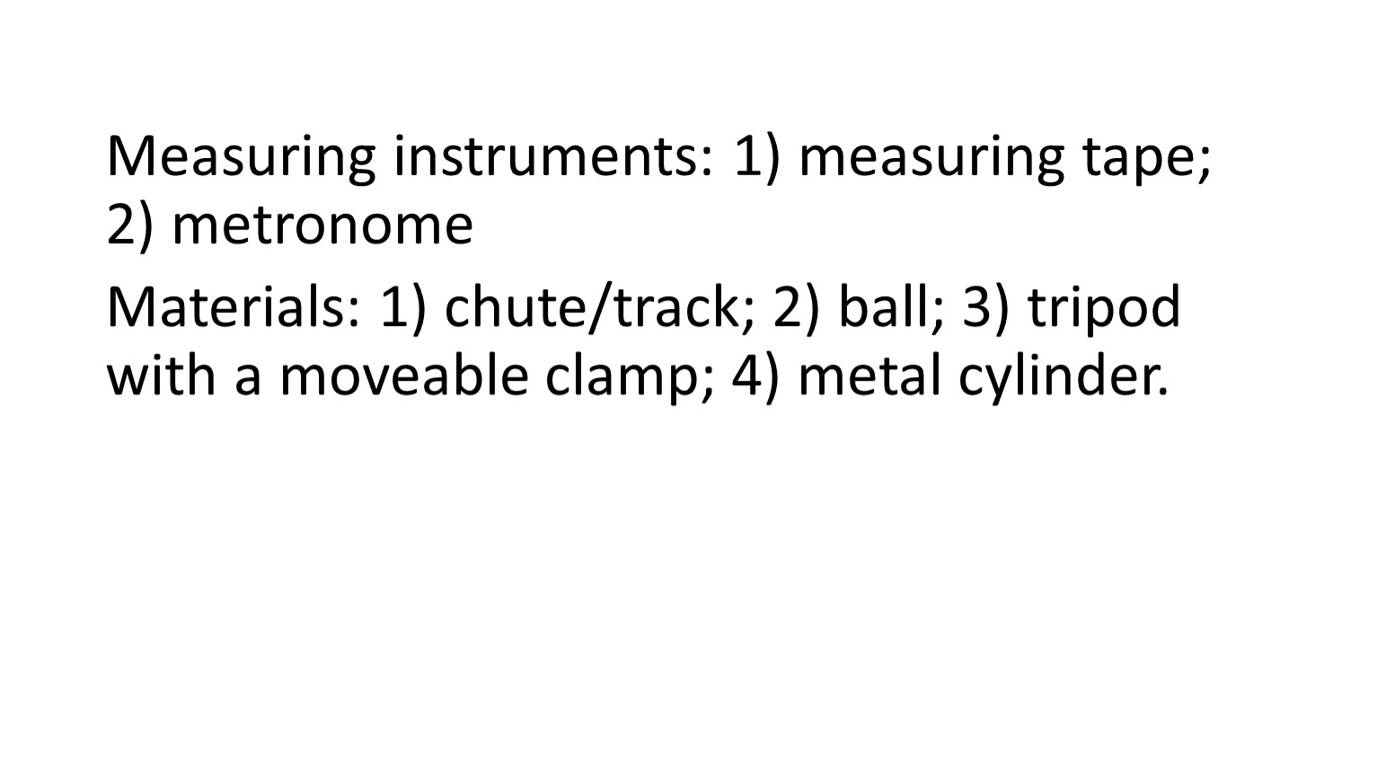 Materials: 1) chute/track; 2) ball; 3) tripod with a moveable clamp; 4) metal cylinder.