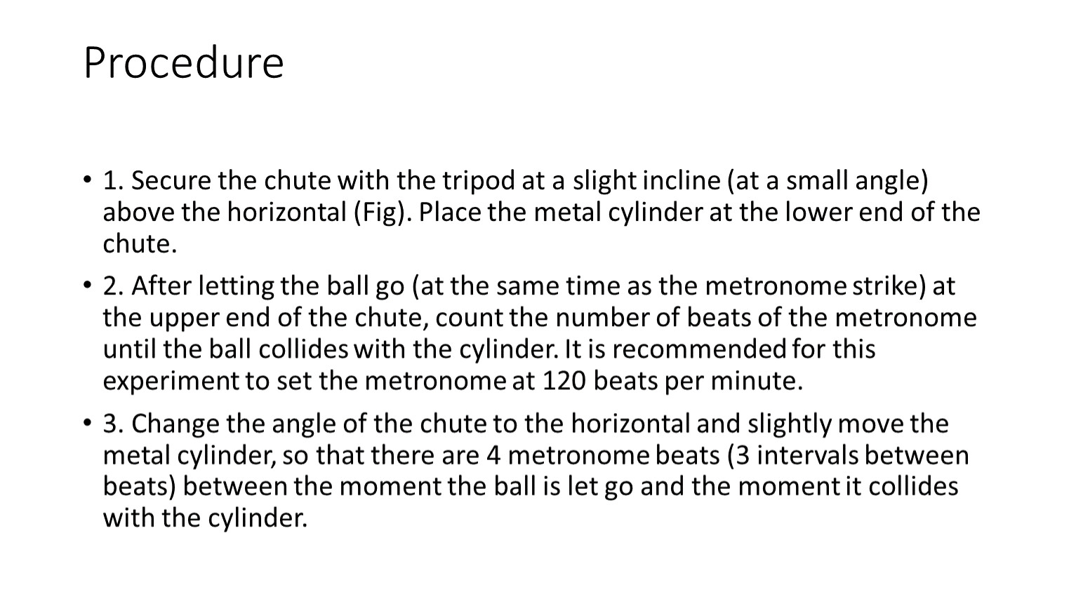 2. After letting the ball go (at the same time as the metronome strike) at the upper end of the chute, count the number of beats of the metronome until the ball collides with the cylinder. It is recommended for this experiment to set the metronome at 120 beats per minute.