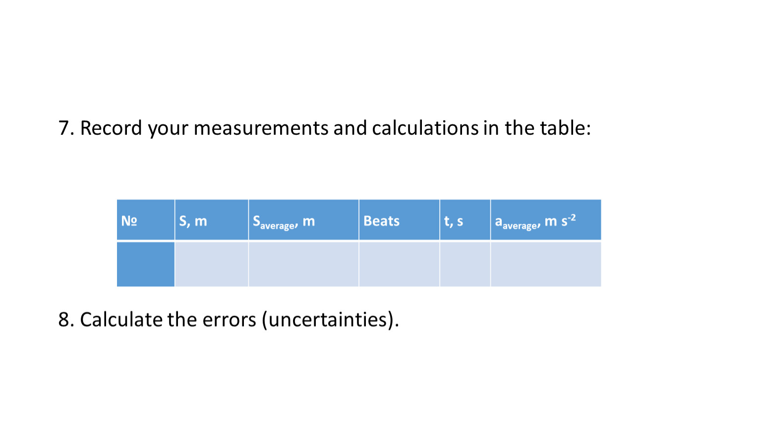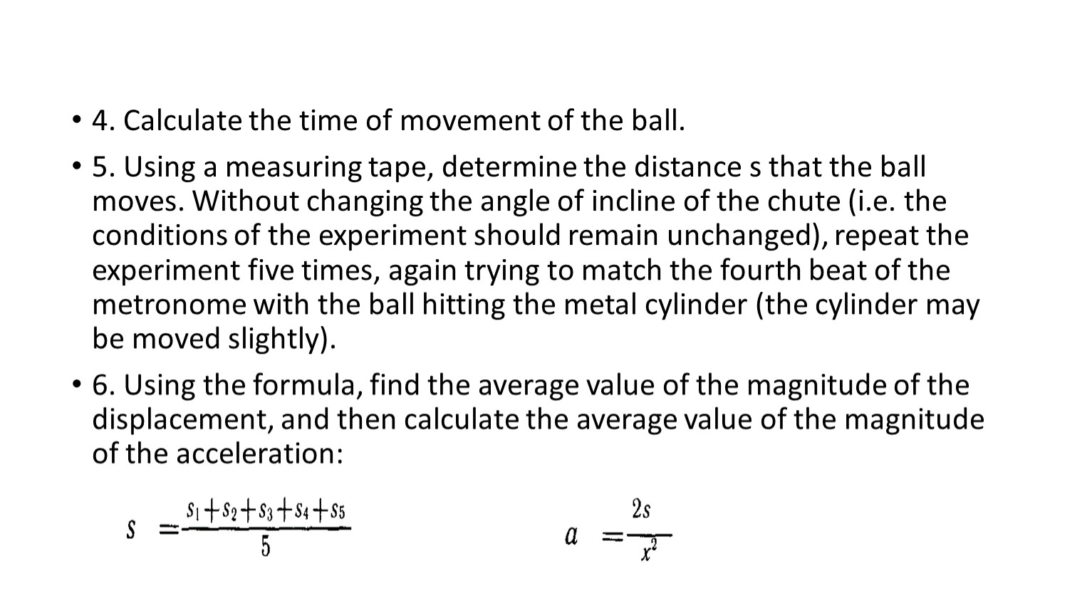 5. Using a measuring tape, determine the distance s that the ball moves. Without changing the angle of incline of the chute (i.e. the conditions of the experiment should remain unchanged), repeat the experiment five times, again trying to match the fourth beat of the metronome with the ball hitting the metal cylinder (the cylinder may be moved slightly).