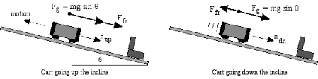 12)Measure and record the acceleration the dynamics cart experiences while moving along the inclined plane at several (minimum of 5-7 different angles). Determine accelerations from the slope of the velocity vs. time graph. Determined the angles from the angle indicator.