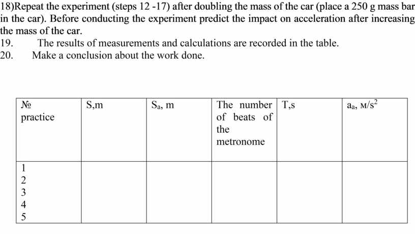 18)Repeat the experiment (steps 12 -17) after doubling the mass of the car (place a 250 g mass bar in the car). Before conducting the experiment predict the impact on acceleration after increasing the mass of the car.