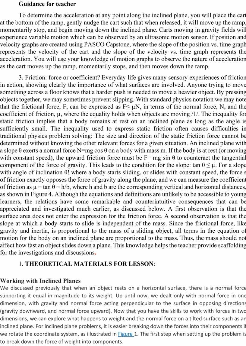 3. Friction: force or coefficient? Everyday life gives many sensory experiences of friction in action, showing clearly the importance of what surfaces are involved. Anyone trying to move something across a floor knows that a harder push is needed to move a heavier object. By pressing objects together, we may sometimes prevent slipping. With standard physics notation we may note that the frictional force, F, can be expressed as F≤ µN, in terms of the normal force, N, and the coefficient of friction, µ, where the equality holds when objects are moving /1/. The inequality for static friction implies that a body remains at rest on an inclined plane as long as the angle is sufficiently small. The inequality used to express static friction often causes difficulties in traditional physics problem solving: The size and direction of the static friction force cannot be determined without knowing the other relevant forces for a given situation. An inclined plane with a slope θ exerts a normal force N=mg cos θ on a body with mass m. If the body is at rest (or moving with constant speed), the upward friction force must be F= mg sin θ to counteract the tangential component of the force of gravity. This leads to the condition for the slope: tan θ ≤ µ. For a slope with angle of inclination θ! where a body starts sliding, or slides with constant speed, the force s of friction exactly opposes the force of gravity along the plane, and we can measure the coefficient of friction as µ = tan θ = h/b, where h and b are the corresponding vertical and horizontal distances, as shown in Figure 4. Although the equations and definitions are unlikely to be accessible to young learners, the relations have some remarkable and counterintuitive consequences that can be appreciated and investigated much earlier, as discussed below. A first observation is that the surface area does not enter the expression for the friction force. A second observation is that the slope at which a body starts to slide is independent of the mass. Since the frictional force, like gravity and inertia, is proportional to the mass of a sliding object, all terms in the equation of motion for the body on an inclined plane are proportional to the mass. Thus, the mass should not affect how fast an object slides down a plane. This knowledge helps the teacher provide scaffolding for the investigations and discussions.