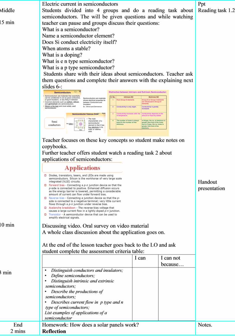 Electric current in semiconductors Students divided into 4 groups and do a reading task about semiconductors. The will be given questions and while watching teacher can pause and groups discuss their questions: What is a semiconductor? Name a semiconductor element? Does Si conduct electricity itself? When atoms a stable? What is a doping? What is e n type semiconductor? What is a p type semiconductor? Students share with their ideas about semiconductors. Teacher ask them questions and complete their answers with the explaining next slides 6-: Teacher focuses on these key concepts so student make notes on copybooks. Further teacher offers student watch a reading task 2 about applications of semiconductors: