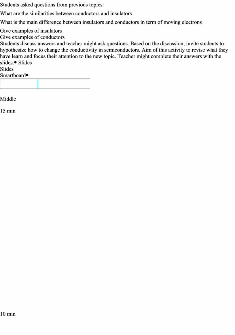 Introduce students with the topic of the lesson and LO. Starter activity 1: Work in pairs Students asked questions from previous topics: What are the similarities between conductors and insulators What is the main difference between insulators and conductors in term of moving electrons Give examples of insulators Give examples of conductors Students discuss answers and teacher might ask questions. Based on the discussion, invite students to hypothesize how to change the conductivity in semiconductors. Aim of this activity to revise what they have learn and focus their attention to the new topic. Teacher might complete their answers with the slides. |