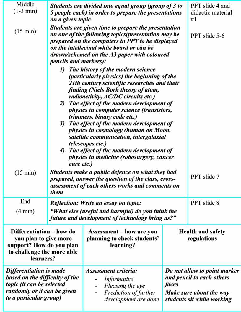 Students are divided into equal group (group of 3 to 5 people each) in order to prepare the presentations on a given topic Students are given time to prepare the presentation on one of the following topics(presentation may be prepared on the computers in PPT to be displayed on the intellectual white board or can be drawn/schemed on the A3 paper with coloured pencils and markers): 1) The history of the modern science (particularly physics) the beginning of the 21th century scientific researches and their finding (Niels Borh theory of atom, radioactivity, AC/DC circuits etc.) 2) The effect of the modern development of physics in computer science (transistors, trimmers, binary code etc.) 3) The effect of the modern development of physics in cosmology (human on Moon, satellite communication, intergalaxial telescopes etc.) 4) The effect of the modern development of physics in medicine (robosurgery, cancer cure etc.) Students make a public defence on what they had prepared, answer the question of the class, cross-assessment of each others works and comments on them |