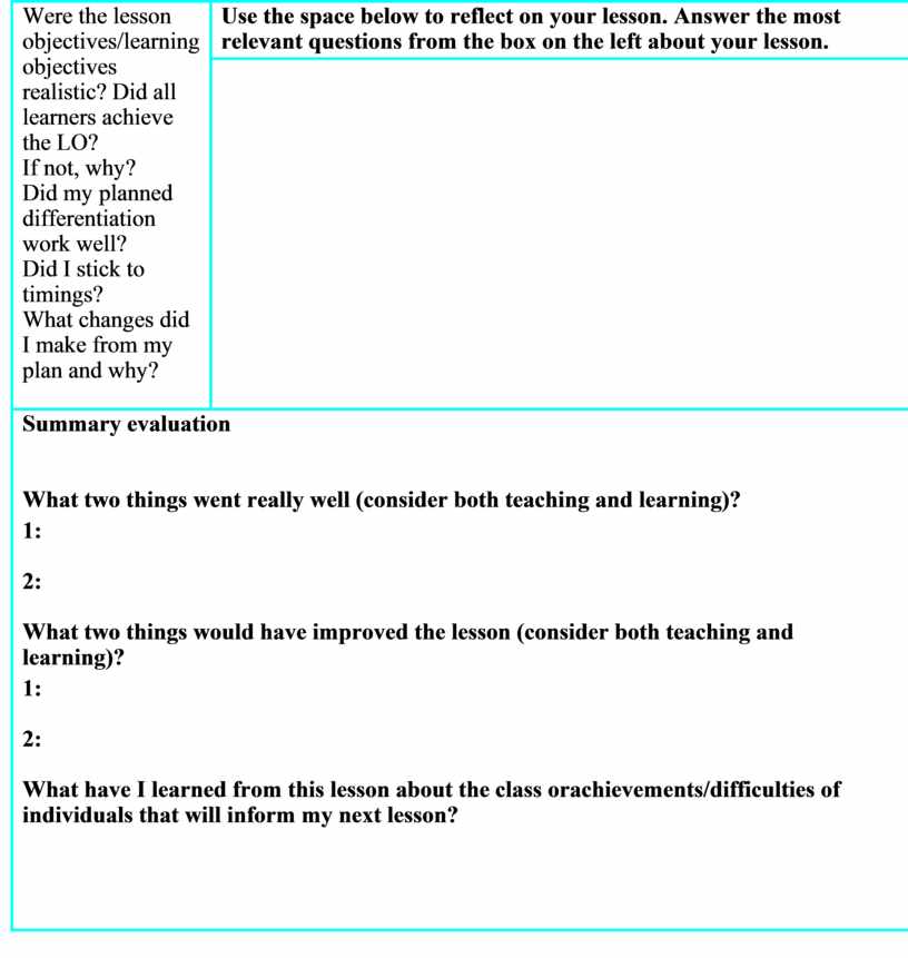 Were the lesson objectives/learning objectives realistic? Did all learners achieve the LO? If not, why? Did my planned differentiation work well? Did I stick to timings? What changes did I make from my plan and why?
