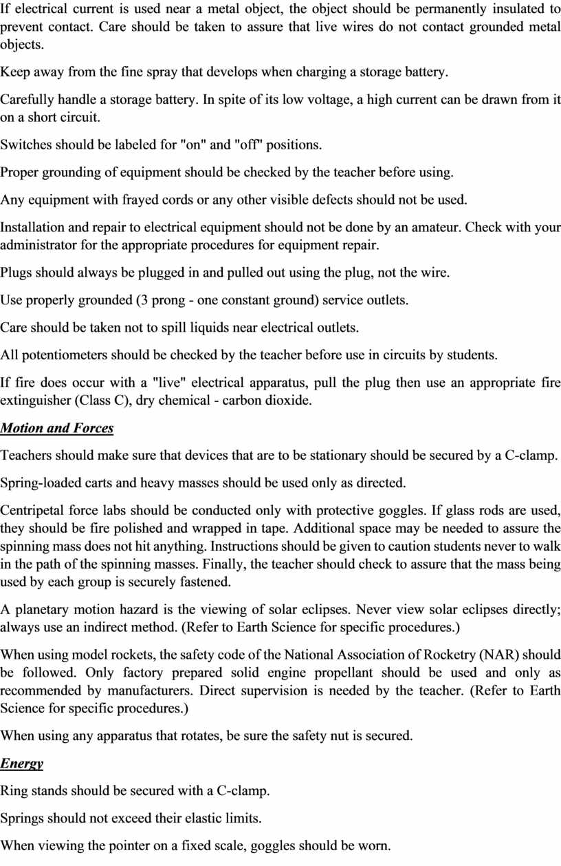 When using model rockets, the safety code of the National Association of Rocketry (NAR) should be followed. Only factory prepared solid engine propellant should be used and only as recommended by manufacturers. Direct supervision is needed by the teacher. (Refer to Earth Science for specific procedures.)