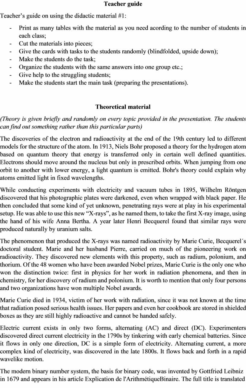 - Print as many tables with the material as you need acording to the number of students in each class;