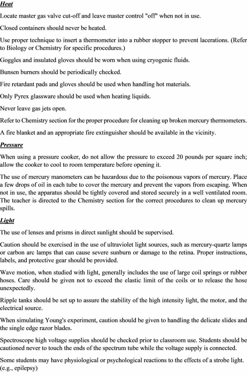 The use of mercury manometers can be hazardous due to the poisonous vapors of mercury. Place a few drops of oil in each tube to cover the mercury and prevent the vapors from escaping. When not in use, the apparatus should be tightly covered and stored securely in a well ventilated room. The teacher is directed to the Chemistry section for the correct procedures to clean up mercury spills.