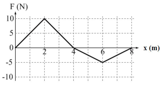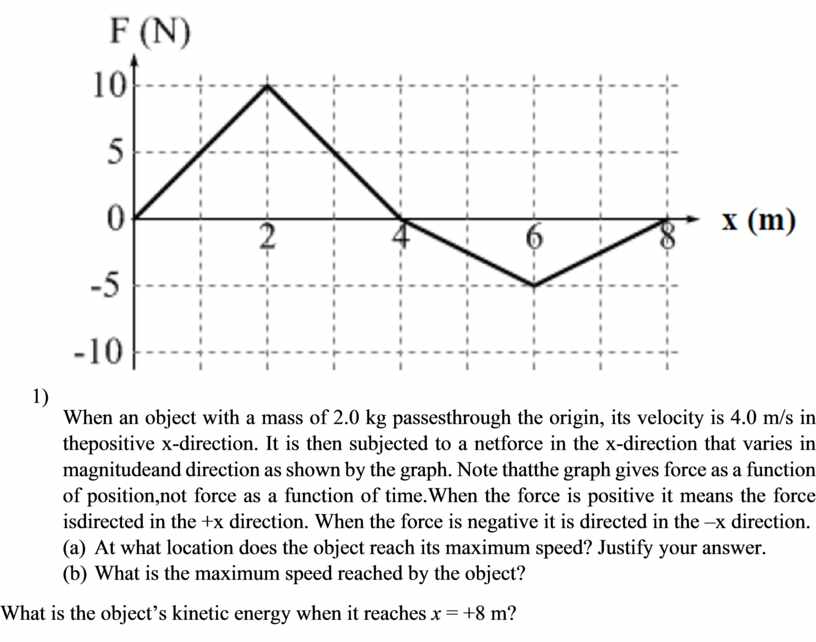 When an object with a mass of 2.0 kg passesthrough the origin, its velocity is 4.0 m/s in thepositive x-direction. It is then subjected to a netforce in the x-direction that varies in magnitudeand direction as shown by the graph. Note thatthe graph gives force as a function of position,not force as a function of time.When the force is positive it means the force isdirected in the +x direction. When the force is negative it is directed in the –x direction.
