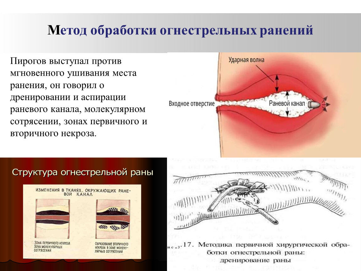 Пирогов выступал против мгновенного ушивания места ранения, он говорил о дренировании и аспирации раневого канала, молекулярном сотрясении, зонах первичного и вторичного некроза.