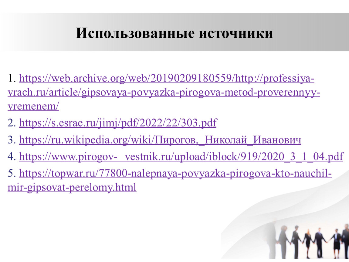 1. https://web.archive.org/web/20190209180559/http://professiya-vrach.ru/article/gipsovaya-povyazka-pirogova-metod-proverennyy-vremenem/
