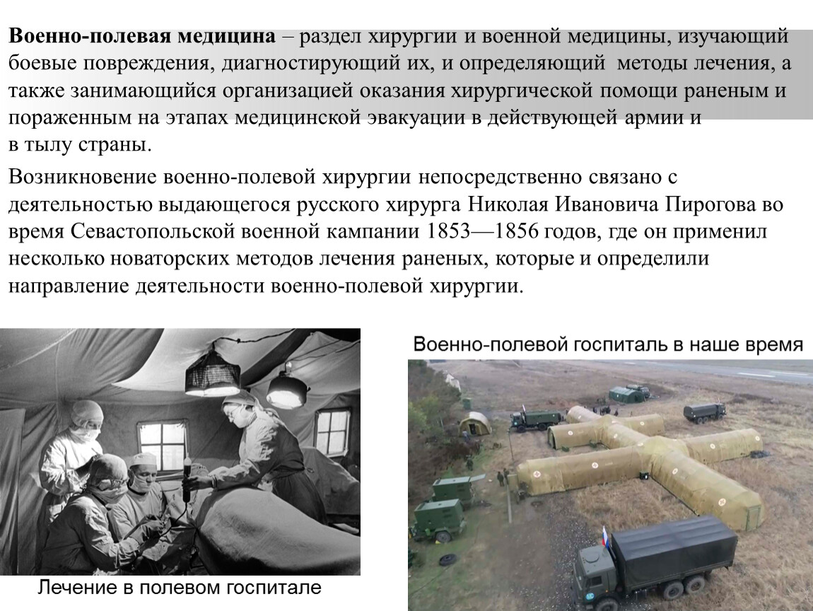 Военно-полевая медицина – раздел хирургии и военной медицины, изучающий боевые повреждения, диагностирующий их, и определяющий  методы лечения, а также занимающийся организацией оказания хирургической помощи раненым и пораженным на этапах медицинской эвакуации в действующей армии и в тылу страны.
