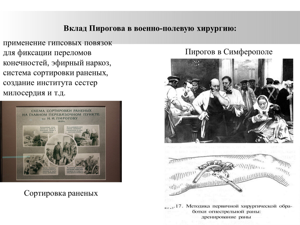 применение гипсовых повязок для фиксации переломов конечностей, эфирный наркоз, система сортировки раненых, создание института сестер милосердия и т.д.