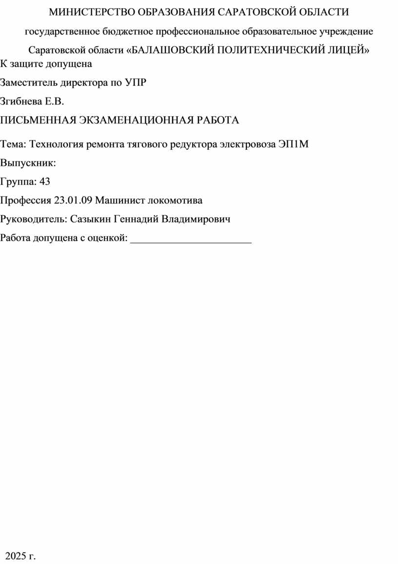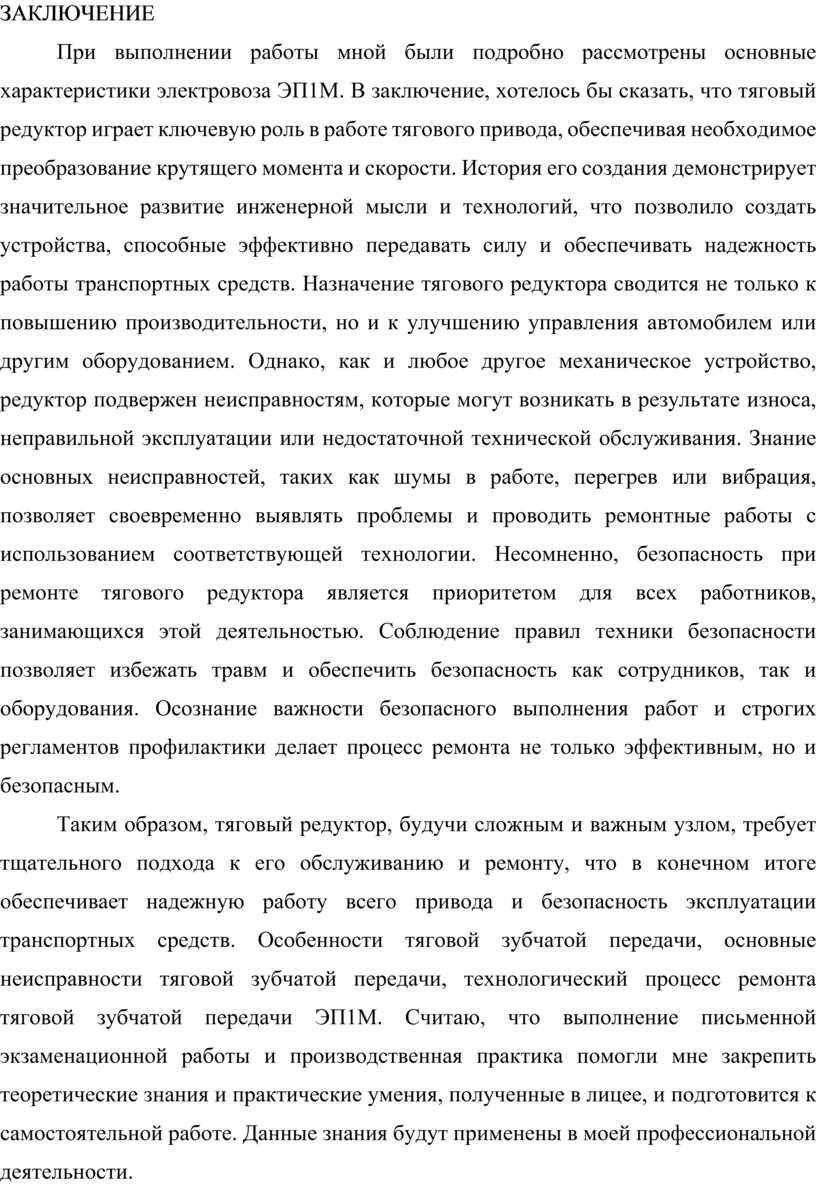 Таким образом, тяговый редуктор, будучи сложным и важным узлом, требует тщательного подхода к его обслуживанию и ремонту, что в конечном итоге обеспечивает надежную работу всего привода и безопасность эксплуатации транспортных средств. Особенности тяговой зубчатой передачи, основные неисправности тяговой зубчатой передачи, технологический процесс ремонта тяговой зубчатой передачи ЭП1М. Считаю, что выполнение письменной экзаменационной работы и производственная практика помогли мне закрепить теоретические знания и практические умения, полученные в лицее, и подготовится к самостоятельной работе. Данные знания будут применены в моей профессиональной деятельности.