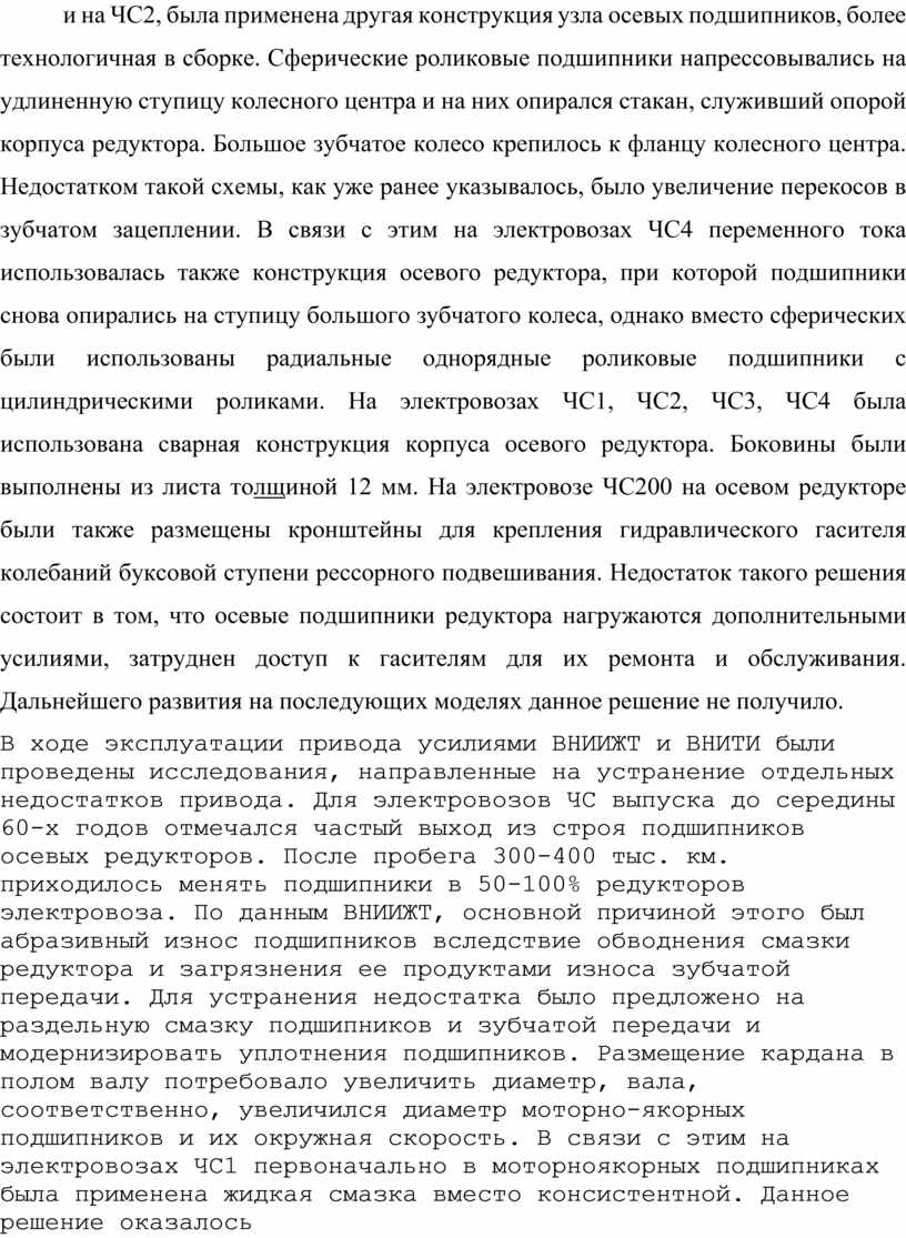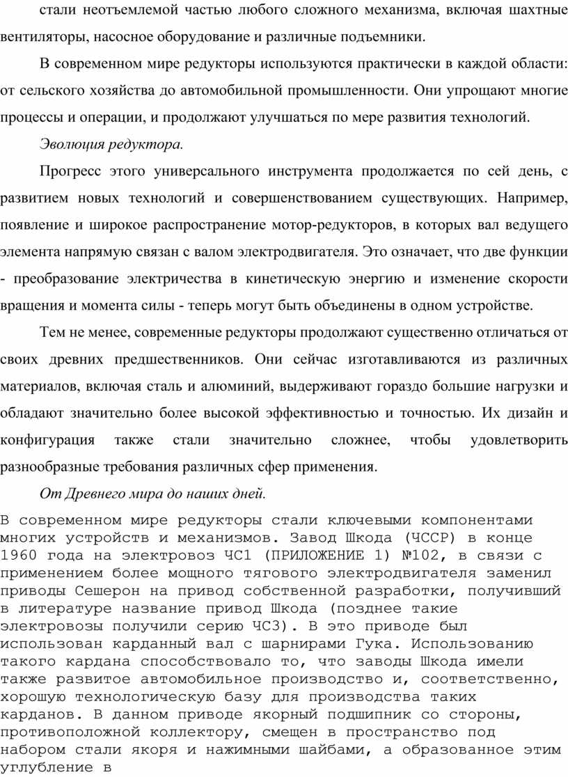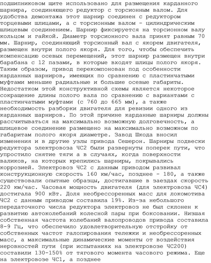 В современном мире редукторы стали ключевыми компонентами многих устройств и механизмов. Завод Шкода (ЧССР) в конце 1960 года на электровоз ЧС1 (ПРИЛОЖЕНИЕ 1) №102, в связи с применением более мощного тягового электродвигателя заменил приводы Сешерон на привод собственной разработки, получивший в литературе название привод Шкода (позднее такие электровозы получили серию ЧС3). В это приводе был использован карданный вал с шарнирами Гука. Использованию такого кардана способствовало то, что заводы Шкода имели также развитое автомобильное производство и, соответственно, хорошую технологическую базу для производства таких карданов. В данном приводе якорный подшипник со стороны, противоположной коллектору, смещен в пространство под набором стали якоря и нажимными шайбами, а образованное этим углубление в подшипниковом щите использовано для размещения карданного шарнира, соединяющего редуктор с торсионным валом. Для удобства демонтажа этот шарнир соединен с редуктором торцевыми шлицами, а с торсионным валом - цилиндрическим шлицевым соединением. Шарнир фиксируется на торсионном валу кольцом и гайкой. Диаметр торсионного вала принят равным 70 мм. Шарнир, соединяющий торсионный вал с якорем двигателя, размещен внутри полого якоря. Для того, чтобы обеспечить компенсацию осевых перемещений, этот шарнир размещен внутри барабана с 12 пазами, в которые входят шлицы полого якоря. Таким образом, привод перекомпонован под особенности карданных шарниров, имеющих по сравнению с пластинчатыми муфтами меньшие радиальные и большие осевые габариты. Недостатком этой конструктивной схемы является некоторое сокращение длины полого вала по сравнению с вариантами с пластинчатыми муфтами (с 760 до 665 мм), а также необходимость разборки двигателя для ревизии одного из карданных шарниров. По этой причине карданные шарниры должны рассчитываться на максимально возможную долговечность, а шлицевое соединение размещено на максимально возможном по габаритам полого якоря диаметре. Завод Шкода вносил изменения и в другие узлы привода Сешерон. Шарниры подвески редуктора электровоза ЧС2 были развернуты поперек пути, что упростило снятие тяги а в случаях, когда поверхности валиков, на которых крепились шарниры, покрывались коррозией. Электровоз ЧС2 с данным приводом развивал конструкционную скорость 160 км/час, позднее - 180, а также существовали опытные образцы, достигавшие в заездах скорость 220 км/час. Часовая мощность двигателя (для электровоза ЧС4) достигала 900 кВт. Доля необрессоренных масс для локомотива ЧС2 с данным приводом составила 19%. Из-за небольшого передаточного числа редуктора электровоз не был склонен к развитию автоколебаний колесной пары при боксовании. Низшая собственная частота колебаний валопроводов привода составила 8-9 Гц, что обеспечило удовлетворительную отстройку от собственных частот галопирования тележки и необрессоренных масс, а максимальные динамические моменты от воздействия неровностей пути (при испытаниях на электровозе ЧС200) составили 130-150% от тягового момента часового режима. Еще на электровозе ЧС1, а позднее и на ЧС2, была применена другая конструкция узла осевых подшипников, более технологичная в сборке. Сферические роликовые подшипники напрессовывались на удлиненную ступицу колесного центра и на них опирался стак