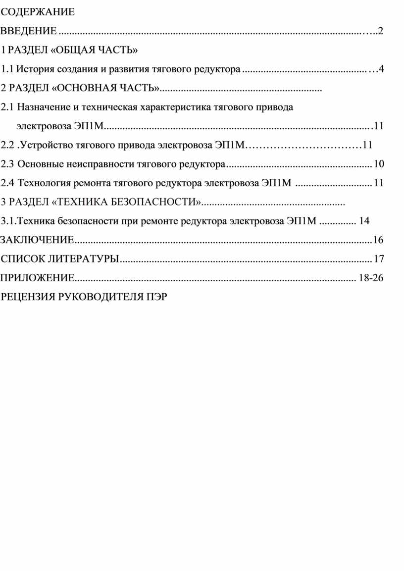 При выполнении работы мной были подробно рассмотрены основные характеристики электровоза ЭП1М. В заключение, хотелось бы сказать, что тяговый редуктор играет ключевую роль в работе тягового привода, обеспечивая необходимое преобразование крутящего момента и скорости. История его создания демонстрирует значительное развитие инженерной мысли и технологий, что позволило создать устройства, способные эффективно передавать силу и обеспечивать надежность работы транспортных средств. Назначение тягового редуктора сводится не только к повышению производительности, но и к улучшению управления автомобилем или другим оборудованием. Однако, как и любое другое механическое устройство, редуктор подвержен неисправностям, которые могут возникать в результате износа, неправильной эксплуатации или недостаточной технической обслуживания. Знание основных неисправностей, таких как шумы в работе, перегрев или вибрация, позволяет своевременно выявлять проблемы и проводить ремонтные работы с использованием соответствующей технологии. Несомненно, безопасность при ремонте тягового редуктора является приоритетом для всех работников, занимающихся этой деятельностью. Соблюдение правил техники безопасности позволяет избежать травм и обеспечить безопасность как сотрудников, так и оборудования. Осознание важности безопасного выполнения работ и строгих регламентов профилактики делает процесс ремонта не только эффективным, но и безопасным.