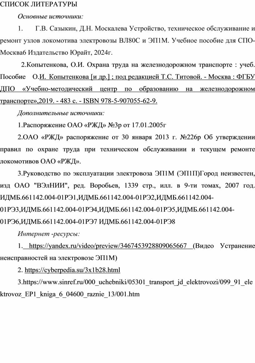 1. Г.В. Сазыкин, Д.Н. Москалева Устройство, техническое обслуживание и ремонт узлов локомотива электровозы ВЛ80С и ЭП1М. Учебное пособие для СПО- Москва6 Издательство Юрайт, 2024г.