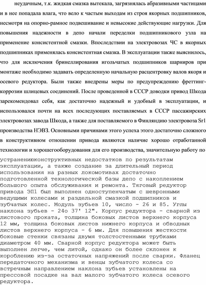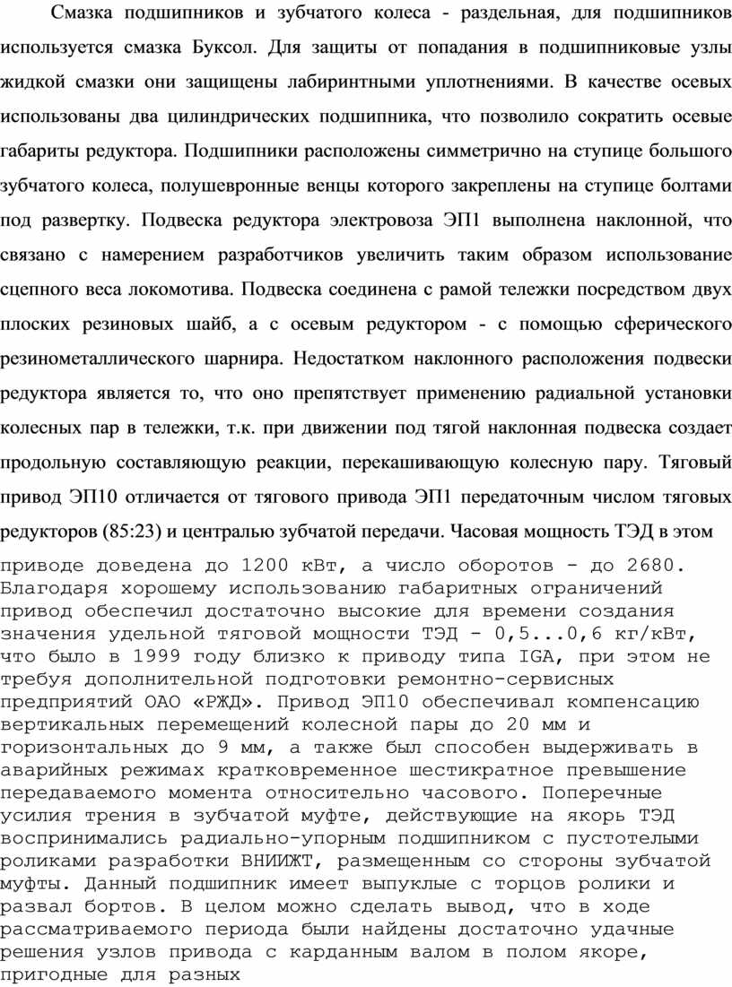 устранениюконструктивных недостатков по результатам эксплуатации, а также создание за длительный период использования на разных локомотивах достаточно подготовленной технологической базы депо с накоплением большого опыта обслуживания и ремонта. Тяговый редуктор привода ЭП1 был выполнен одноступенчатым с шевронными ведущими колесами и раздельной смазкой подшипников и зубчатых колес. Модуль зубьев 10, число - 26 и 85. Углы наклона зубьев - 24о 37' 12". Корпус редуктора - сварной из листового проката, толщина боковых листов верхнего корпуса 12 мм, толщина боковых листов нижнего корпуса и обводных листов верхнего корпуса - 6 мм. Для повышения жесткости боковые стенки связаны двумя толстостенными трубками диаметром 40 мм. Сварной корпус редуктора может быть выполнен легче, чем литой, однако он более склонен к короблению из-за остаточных напряжений после сварки. Фланец передаточного механизма и венцы зубчатого колеса со встречным направлением наклона зубьев установлены на прессовой посадке на вал малого зубчатого колеса осевого редуктора. Смазка подшипников и зубчатого колеса - раздельная, для подшипников используется смазка Буксол. Для защиты от попадания в подшипниковые узлы жидкой смазки они защищены лабиринтными уплотнениями. В качестве осевых использованы два цилиндрических подшипника, что позволило сократить осевые габариты редуктора. Подшипники расположены симметрично на ступице большого зубчатого колеса, полушевронные венцы которого закреплены на ступице болтами под развертку. Подвеска редуктора электровоза ЭП1 выполнена наклонной, что связано с намерением разработчиков увеличить таким образом использование сцепного веса локомотива. Подвеска соединена с рамой тележки посредством двух плоских резиновых шайб, а с осевым редуктором - с помощью сферического резинометаллического шарнира. Недостатком наклонного расположения подвески редуктора является то, что оно препятствует применению радиальной установки колесных пар в тележки, т.к. при движении под тягой наклонная подвеска создает продольную составляющую реакции, перекашивающую колесную пару. Тяговый привод ЭП10 отличается от тягового привода ЭП1 передаточным числом тяговых редукторов (85:23) и централью зубчатой передачи. Часовая мощность ТЭД в этом