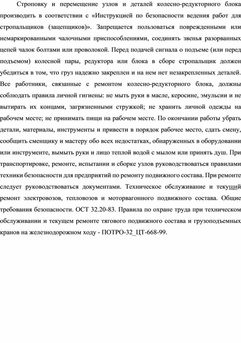 Строповку и перемещение узлов и деталей колесно-редукторного блока производить в соответствии с «Инструкцией по безопасности ведения работ для стропальщиков (зацепщиков)». Запрещается пользоваться поврежденными или немаркированными чалочными приспособлениями, соединять звенья разорванных цепей чалок болтами или проволокой. Перед подачей сигнала о подъеме (или перед подъемом) колесной пары, редуктора или блока в сборе стропальщик должен убедиться в том, что груз надежно закреплен и на нем нет незакрепленных деталей. Все работники, связанные с ремонтом колесно-редукторного блока, должны соблюдать правила личной гигиены: не мыть руки в масле, керосине, эмульсии и не вытирать их концами, загрязненными стружкой; не хранить личной одежды на рабочем месте; не принимать пищи на рабочем месте. По окончании работы убрать детали, материалы, инструменты и привести в порядок рабочее место, сдать смену, сообщить сменщику и мастеру обо всех недостатках, обнаруженных в оборудовании или инструменте, вымыть руки и лицо теплой водой с мылом или принять душ. При транспортировке, ремонте, испытании и сборке узлов руководствоваться правилами техники безопасности для предприятий по ремонту подвижного состава. При ремонте следует руководствоваться документами. Техническое обслуживание и текущий ремонт электровозов, тепловозов и моторвагонного подвижного состава. Общие требования безопасности. ОСТ 32.20-83. Правила по охране труда при техническом обслуживании и текущем ремонте тягового подвижного состава и грузоподъемных кранов на железнодорожном ходу - ПОТРО-32_ЦТ-668-99.