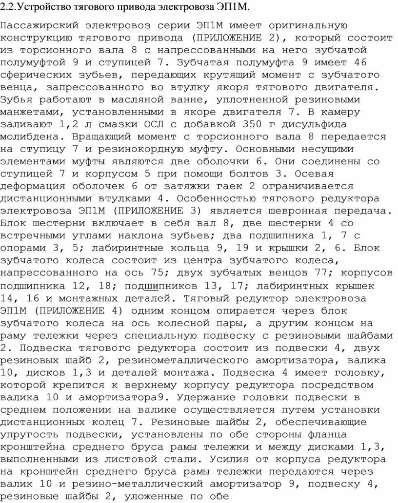 Пассажирский электровоз серии ЭП1М имеет оригинальную конструкцию тягового привода (ПРИЛОЖЕНИЕ 2), который состоит из торсионного вала 8 с напрессованными на него зубчатой полумуфтой 9 и ступицей 7. Зубчатая полумуфта 9 имеет 46 сферических зубьев, передающих крутящий момент с зубчатого венца, запрессованного во втулку якоря тягового двигателя. Зубья работают в масляной ванне, уплотненной резиновыми манжетами, установленными в якоре двигателя 7. В камеру заливают 1,2 л смазки ОСЛ с добавкой 350 г дисульфида молибдена. Вращающий момент с торсионного вала 8 передается на ступицу 7 и резинокордную муфту. Основными несущими элементами муфты являются две оболочки 6. Они соединены со ступицей 7 и корпусом 5 при помощи болтов 3. Осевая деформация оболочек 6 от затяжки гаек 2 ограничивается дистанционными втулками 4. Особенностью тягового редуктора электровоза ЭП1М (ПРИЛОЖЕНИЕ 3) является шевронная передача. Блок шестерни включает в себя вал 8, две шестерни 4 со встречными углами наклона зубьев; два подшипника 1, 7 с опорами 3, 5; лабиринтные кольца 9, 19 и крышки 2, 6. Блок зубчатого колеса состоит из центра зубчатого колеса, напрессованного на ось 75; двух зубчатых венцов 77; корпусов подшипника 12, 18; подшипников 13, 17; лабиринтных крышек 14, 16 и монтажных деталей. Тяговый редуктор электровоза ЭП1М (ПРИЛОЖЕНИЕ 4) одним концом опирается через блок зубчатого колеса на ось колесной пары, а другим концом на раму тележки через специальную подвеску с резиновыми шайбами 2. Подвеска тягового редуктора состоит из подвески 4, двух резиновых шайб 2, резинометаллического амортизатора, валика 10, дисков 1,3 и деталей монтажа. Подвеска 4 имеет головку, которой крепится к верхнему корпусу редуктора посредством валика 10 и амортизатора9. Удержание головки подвески в среднем положении на валике осуществляется путем установки дистанционных колец 7. Резиновые шайбы 2, обеспечивающие упругость подвески, установлены по обе стороны фланца кронштейна среднего бруса рамы тележки и между дисками 1,3, выполненными из листовой стали. Усилия от корпуса редуктора на кронштейн среднего бруса рамы тележки передаются через валик 10 и резино-металлический амортизатор 9, подвеску 4, резиновые шайбы 2, уложенные по обе стороны фланца кронштейна и закрепленные гайкой, через диски 1,3. На боковине верхнего корпуса редуктора имеется выступ, который входит в прямоугольное отверстие планки, прикрепляемой к среднему брусу двумя болтами М20 с гайками и служат для удержания редуктора от падения на путь в случае обрыва подвески 4.