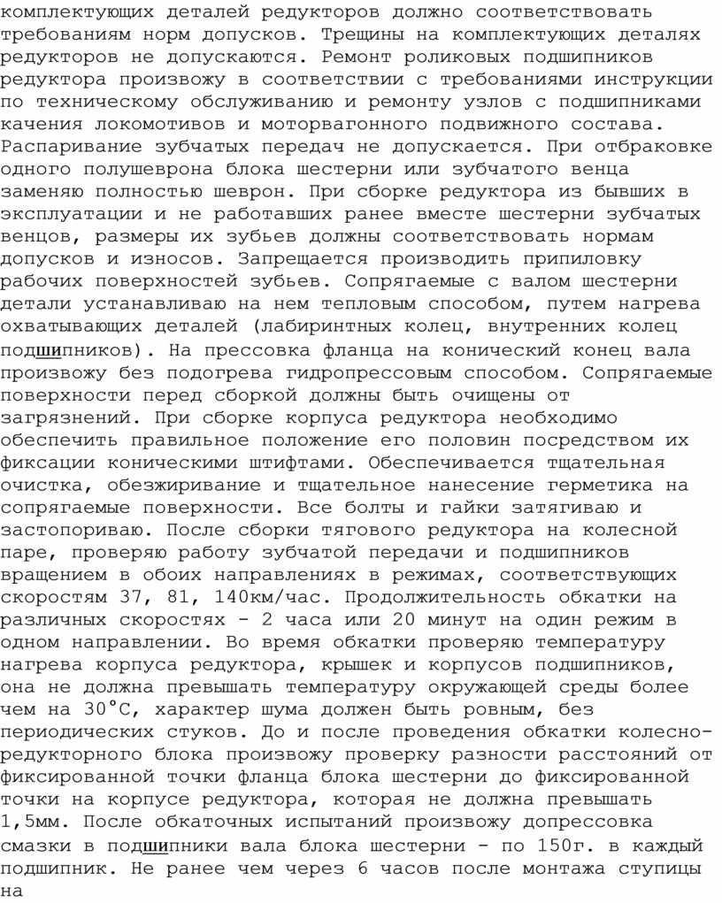 целостность резинокордных оболочек, надежность крепления муфты к фланцу валашестерни. При замене резинокордной оболочки без спрессовки ступицы допускается разрезать ее по радиусу в одном месте. Центры отверстий в оболочке под болты должны лежать на одном радиусе и совпадать с местом реза. Оболочки устанавливаю в муфте разрезами в диаметрально противоположном положении. Проверяю корпус редукторов на отсутствие трещин и течи смазки. Тяговый редуктор перед разборкой проверяю наличие одинаковых клейм на обоих половинах корпуса редуктора (при отсутствии клейм наношу одинаковые номера).Распаривание половин корпуса редуктора не допускается. Перед разборкой провожу определение технического состояния опорного подшипника редуктора со стороны колесного центра при помощи средств виброакустического диагностирования. В процессе полного освидетельствования колесной пары отбираю пробу смазки для анализа в химической лаборатории. При неудовлетворительных результатах диагностирования или химического анализа подшипник заменяю новым. Детали и узлы редуктора очищаю от смазки, загрязнений и герметика. Проверяю состояние верхних и нижних половинок корпуса редуктора. Проверяю состояние и произвожу дефектоскопию (ПРИЛОЖЕНИЕ 7) блоков шестерен (вала, зубьев шестерен). Состояние комплектующих деталей редукторов должно соответствовать требованиям норм допусков. Трещины на комплектующих деталях редукторов не допускаются. Ремонт роликовых подшипников редуктора произвожу в соответствии с требованиями инструкции по техническому обслуживанию и ремонту узлов с подшипниками качения локомотивов и моторвагонного подвижного состава. Распаривание зубчатых передач не допускается. При отбраковке одного полушеврона блока шестерни или зубчатого венца заменяю полностью шеврон. При сборке редуктора из бывших в эксплуатации и не работавших ранее вместе шестерни зубчатых венцов, размеры их зубьев должны соответствовать нормам допусков и износов. Запрещается производить припиловку рабочих поверхностей зубьев. Сопрягаемые с валом шестерни детали устанавливаю на нем тепловым способом, путем нагрева охватывающих деталей (лабиринтных колец, внутренних колец подшипников). На прессовка фланца на конический конец вала произвожу без подогрева гидропрессовым способом. Сопрягаемые поверхности перед сборкой должны быть очищены от загрязнений. При сборке корпуса редуктора необходимо обеспечить правильное положение его половин посредством их фиксации коническими штифтами. Обеспечивается тщательная очистка, обезжиривание и тщательное нанесение герметика на сопрягаемые поверхности. Все болты и гайки затягиваю и застопориваю. После сборки тягового редуктора на колесной паре, проверяю работу зубчатой передачи и подшипников вращением в обоих направлениях в режимах, соответствующих скоростям 37, 81, 140км/час. Продолжительность обкатки на различных скоростях - 2 часа или 20 минут на один режим в одном направлении. Во время обкатки проверяю температуру нагрева корпуса редуктора, крышек и корпусов подшипников, она не должна превышать температуру окружающей среды более чем на 30°С, характер шума должен быть ровным, без периодических стуков. До и после проведения обкатки колесно- редукторного блока произвожу проверку разности расстояний от фикс