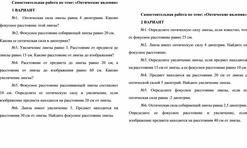 №1. Оптическая сила линзы равна 4 диоптриям. Каково фокусное расстояние этой линзы?