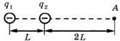 4. Два точечных отрицательных заряда: q1=-120 нКл и q2=-40 нКл находятся в вакууме на расстоянии L=1м друг от друга. Определите величину напряженности электростатического поля этих зарядов в точке А, расположенной на прямой, соединяющей заряды, на расстоянии 2L от второго заряда (см.рис.).