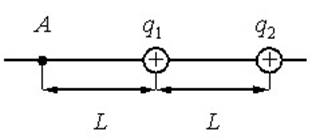 4. Два точечных положительных заряда: q1=340 нКл и q2=560 нКл находятся в вакууме на расстоянии L=4 м друг от друга. Определите величину напряженности электростатического поля этих зарядов в точке А, расположенной на прямой, соединяющей заряды, на расстоянии L от первого заряда (см. рис)