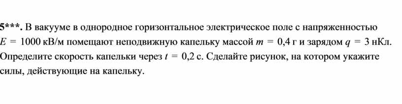 5***. В вакууме в однородное горизонтальное электрическое поле с напряженностью E = 1000 кВ/м помещают неподвижную капельку массой m = 0,4 г и зарядом q = 3 нКл. Определите скорость капельки через t = 0,2 с. Сделайте рисунок, на котором укажите силы, действующие на капельку.